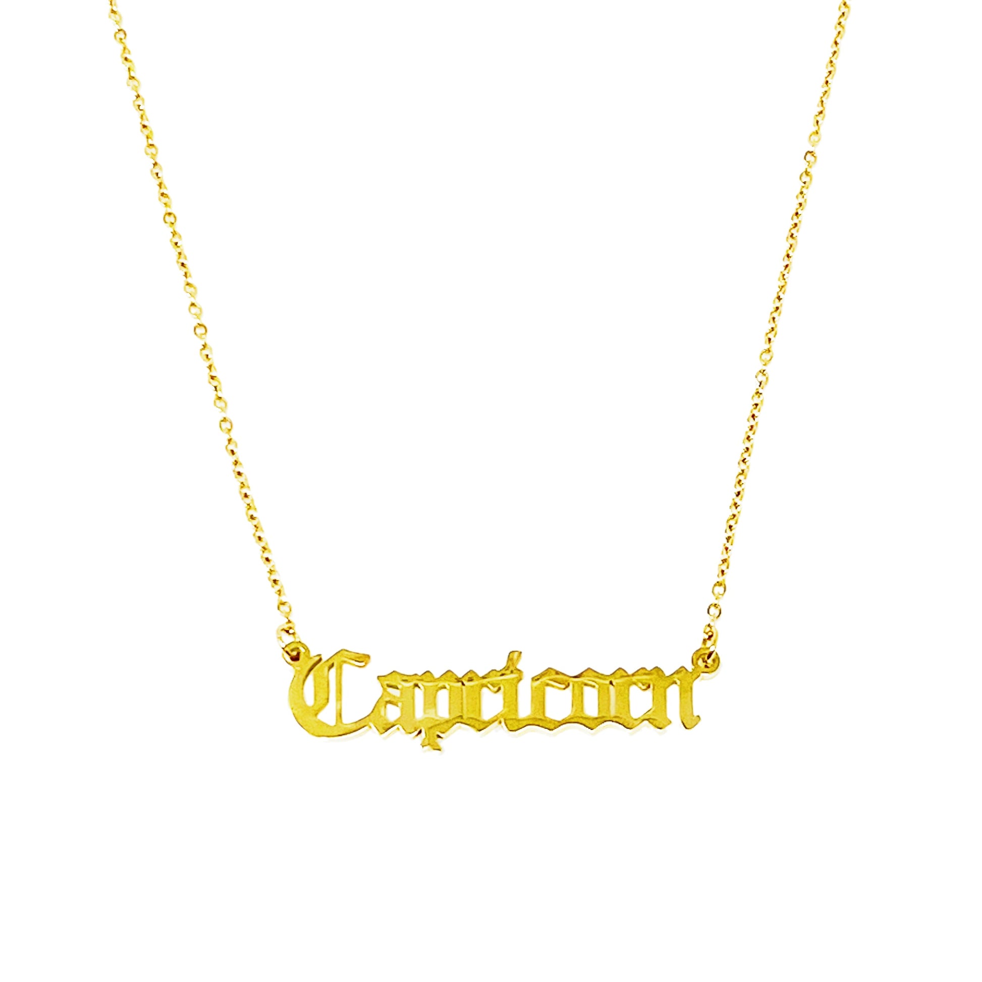 Zodiac names in an Olde English font. Each zodiac is beautifully lettered in a classy font, made with a dense, high-quality metal. Great to wear on its own or layer with any necklace in your collection! Express your unique style with our Old English Zodiac Necklace. Made of durable stainless steel with a luxurious gold plating, this necklace is sure to turn heads. Stay connected to your zodiac sign with a sexy twist.